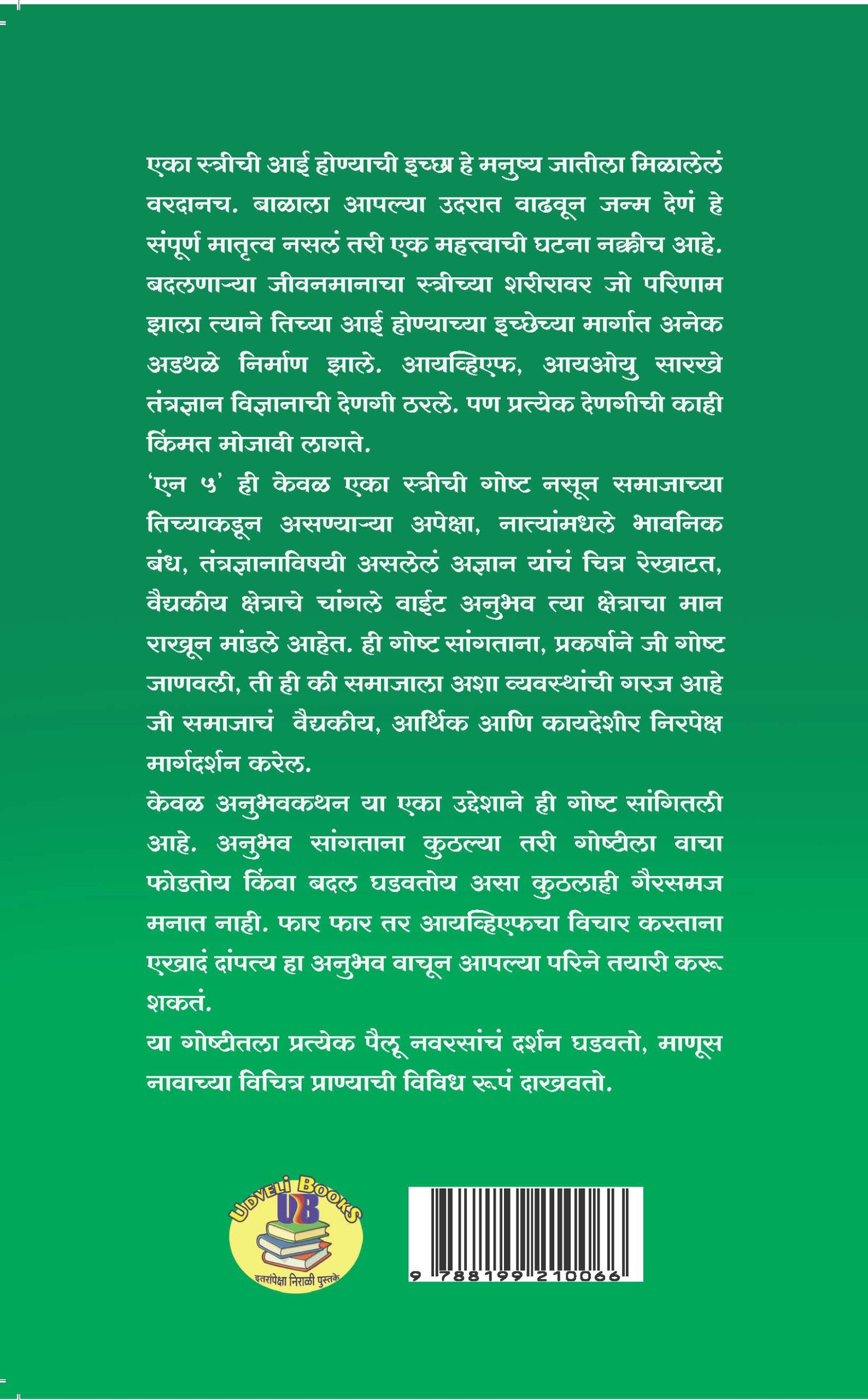 ‘एन ५ ही केवळ एका स्त्रीची गोष्ट नसून समाजाच्या तिच्याकडून असण्याऱ्या अपेक्षा, नात्यांमधले भावनिक बंध, तंत्रज्ञानाविषयी असलेलं अज्ञान यांचं चित्र रेखाटत, वैद्यकीय क्षेत्राचे चांगले वाईट अनुभव त्या क्षेत्राचा मान राखून मांडले आहेत. ही गोष्ट सांगताना, प्रकर्षाने जी गोष्ट जाणवली, ती ही की समाजाला अशा व्यवस्थांची गरज आहे जी समाजाचं वैद्यकीय, आर्थिक आणि कायदेशीर निरपेक्ष मार्गदर्शन करेल.